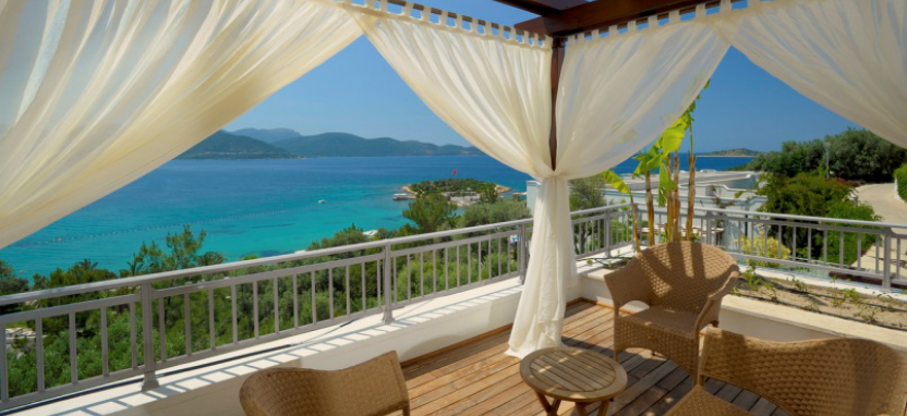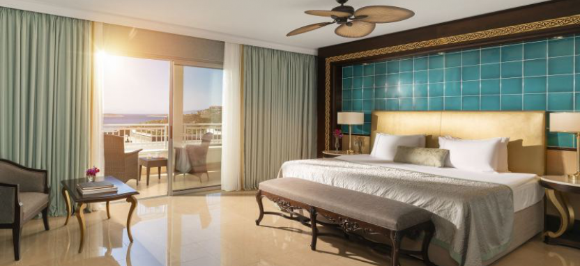 Deluxe Room Sea View (42 кв. м) - спальня, ванная комната, балкон. Расположены в главном здании или в отдельных корпусах в саду. Вид на море.