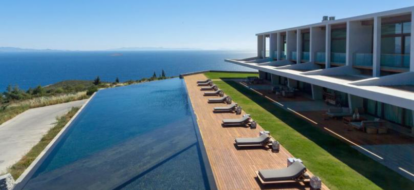 Ridge Terrace Room with Pool (41-46 кв. м) - терраса с открытым персональным бассейном (12 кв. м), частный сад, спальня, гардеробная, ванная комната. Расположены на холме в отдалении от главного здания. Вид на море.