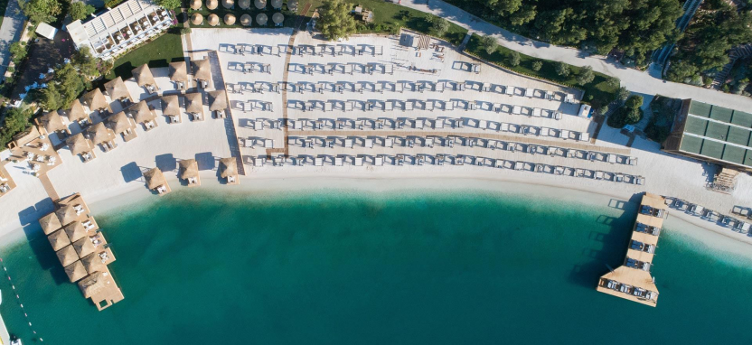 Собственный песчаный пляж, оборудованный зонтиками и шезлонгами.