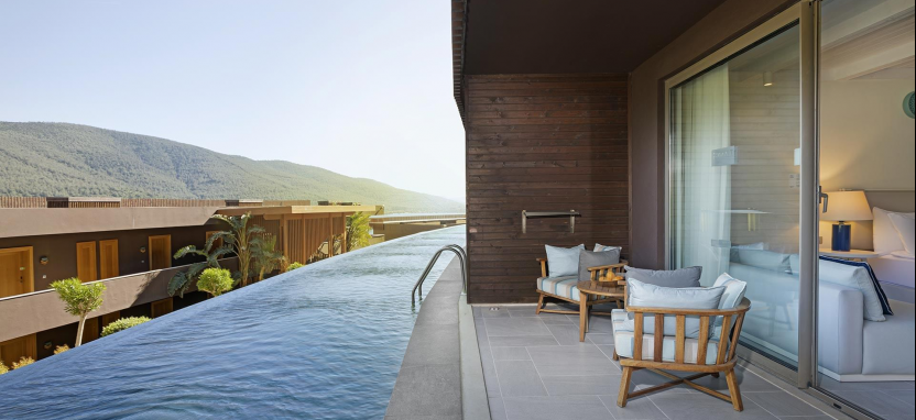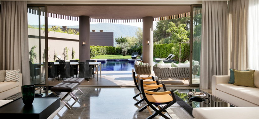 Superior Villa (300 кв. м) - трехуровневая вилла. Терраса с открытым персональным бассейном, балконы, гостиная с обеденной и кухонной зоной, 2 спальни, гардеробная, сауна, 3 ванные комнаты. Вид на море и окрестности. Услуги персонального дворецкого. Гости данных номеров имеют особые привилегии.