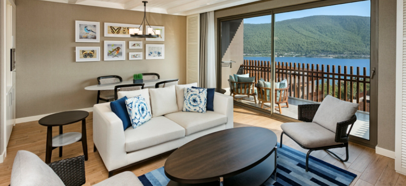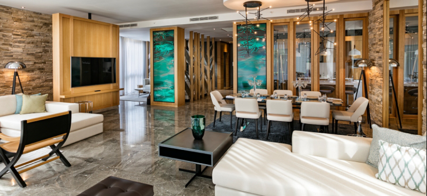 Deluxe Family Suite (90 кв. м) - гостиная с обеденной и кухонной зоной (стол на 6 персон), 2 спальни, балкон, 2 ванные комнаты. Вид на море.