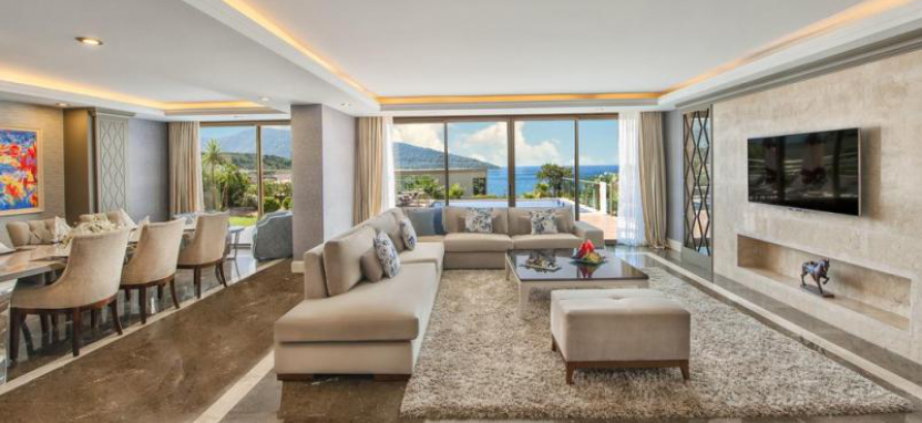 Presidential Villa (800 кв. м) - двухэтажная вилла. Терраса с открытым персональным бассейном, гостиная с обеденной зоной, кухня, 6 спален, 6 ванных комнат. Дополнительно: посудомоечная машина, микроволновая печь, стиральная машина. Вид на море. Услуги персонального камердинера. Гости данных вилл имеют особые привилегии.