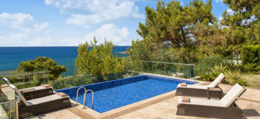 Afrodite Villa (190 кв. м) - двухэтажная вилла. Терраса с открытым персональным бассейном, гостиная с обеденной зоной, мини-кухня, 2 спальни (одна с кроватью king-size, вторая с двумя отдельными кроватями), 2 ванные комнаты. Дополнительно: посудомоечная машина, микроволновая печь, стиральная машина. Вид на море. Гости данных вилл имеют особые привилегии.