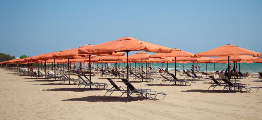 Собственный песчаный пляж, оборудованный зонтиками и шезлонгами.