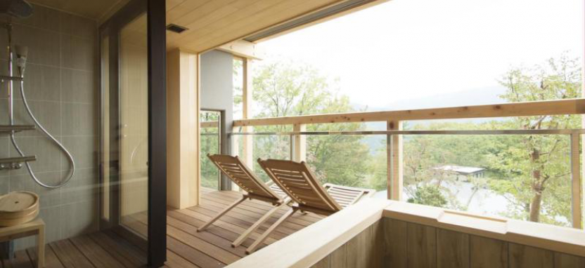 Suite Sumire (66 кв. м) – угловой сьют, расположен на 2 этаже, рассчитан на 4 человек. В спальне две кровати шириной по 125 см и массажное кресло. Из купальни под открытым небом можно любоваться горами Хаконэ.