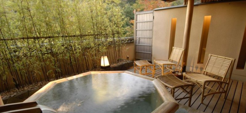 Kadan Suite With Panoramic Wooden Bath "Yugao" - вмещает до 4 человек. Всего 1 такой номер. Гостиная 20 кв. м, спальня 10 кв. м, терраса. Квадратная деревянная ванна. Кровать - футон на татами.