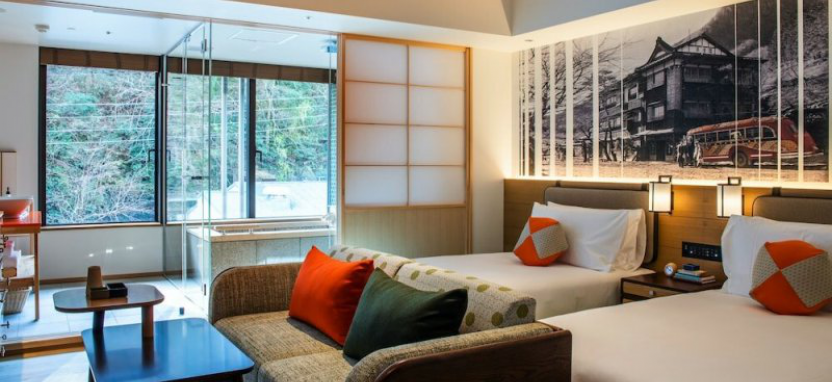Deluxe Twin Riverside (38 кв. м) - представляет собой изящно оформленное пространство с приятным видом на покрытые деревьями горы и протекающую реку Хая. Спальня с двумя односпальными кроватями. Ванная комната: отдельный открытый onsen (перекаченная вода из горячего источника) и отдельная душевая кабина. В распоряжении есть выдвижная кровать.