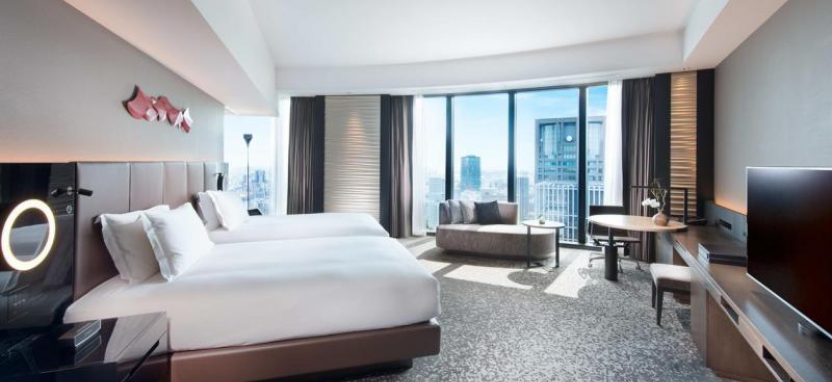 Просторные номера с панорамными окнами, спа-салон, бассейн, 4 ресторана. Есть номера для маломобильных людей. Гости повышенной категории номеров и люксов могут посещать представительский лаунж.